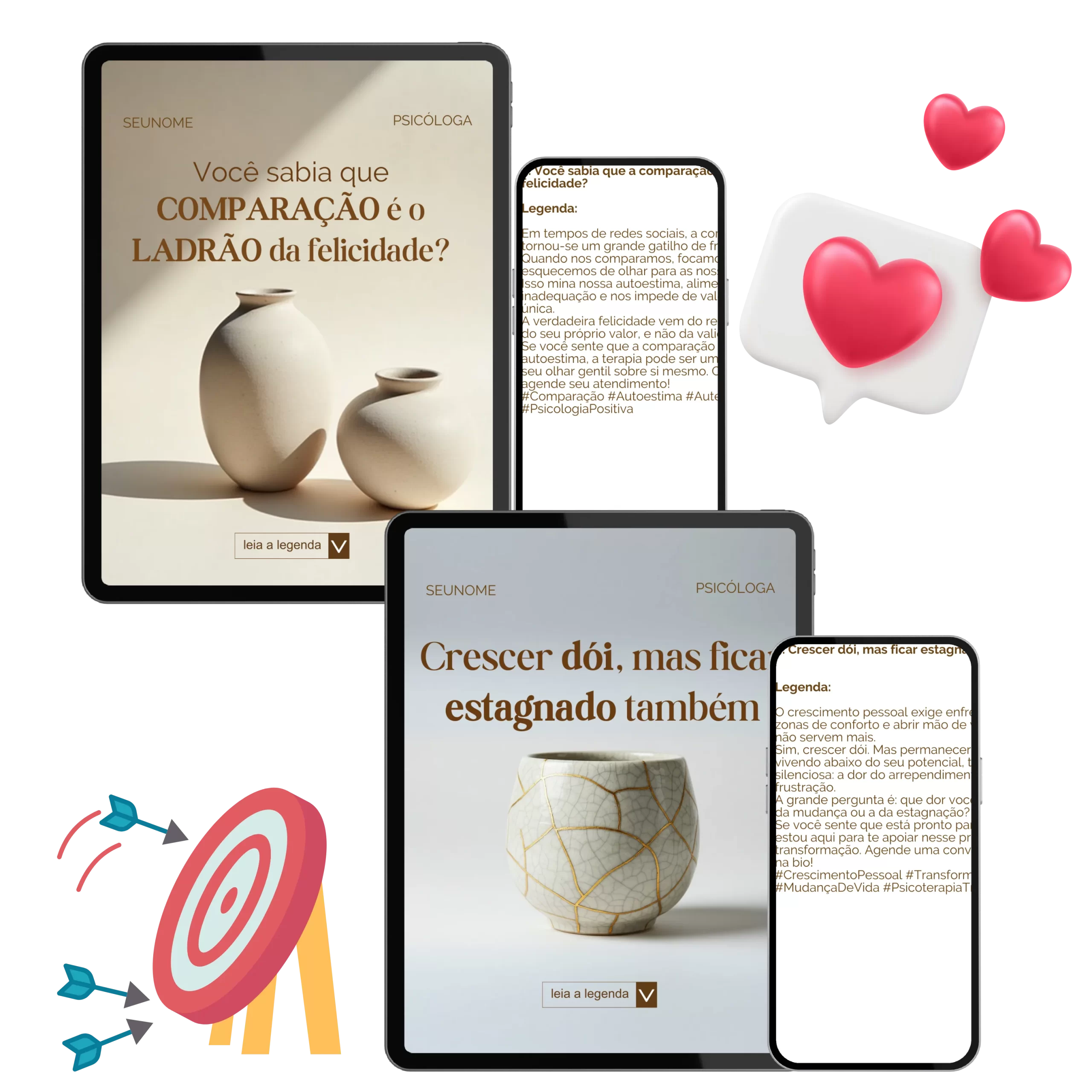 Receba DIVERSOS posts PRONTOS. Todos os posts já possuem conteúdo EXCLUSIVO para psicólogas e terapeutas + LEGENDAS PRONTAS para todos posts, com até as mesmo hashtags para atrair o público certo interessado em seus serviços!